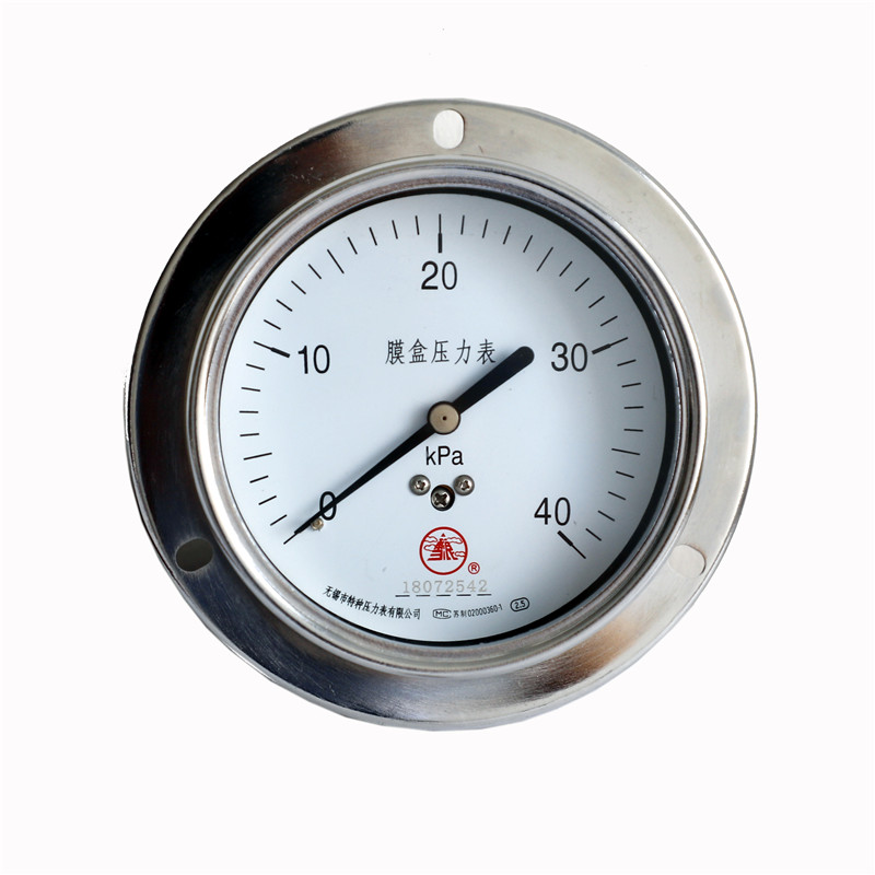 不銹鋼膜盒壓力表采用不銹鋼波紋膜盒作為測量微小壓力的敏感元件。不銹鋼膜盒壓力表適用于測量對不銹鋼不起腐蝕作用,無爆炸危險的氣體或液體的微小壓力。表盤上面有調零裝置,可以方便調整零位。不銹鋼膜盒壓力表廣泛應用于石油、化工、冶金等工業部門壓力測量,不銹鋼膜盒壓力表可以就地安裝并現場指示壓力。