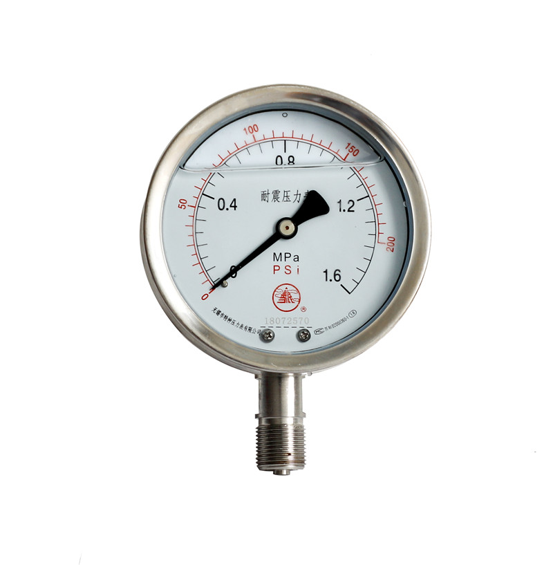 耐震不銹鋼壓力表在表體內充裝阻尼液并且加裝阻尼裝置,使壓力表起到減震、抗震的作用,適應劇烈振動環境,耐受脈動介質及沖擊載荷。耐震不銹鋼壓力表全部采用不銹鋼材料制造,主要零件采用不銹鋼SUS316L材料,適用于有腐蝕性氣體環境,可檢測腐蝕性較強介質的壓力或真空,壓力表指示穩定清晰。廣泛應用于石油、化工、機械、冶金等工業部門壓力測量。本公司可根據用戶需要,設計、制造特殊用途的耐震不銹鋼壓力表產品,歡迎來人來電、來函洽談!
