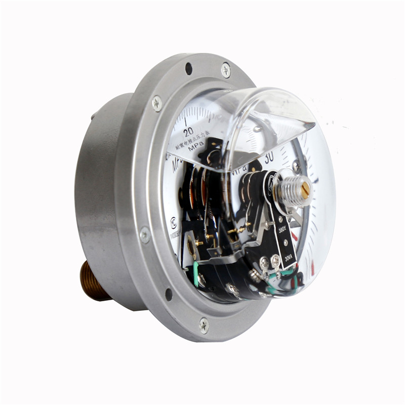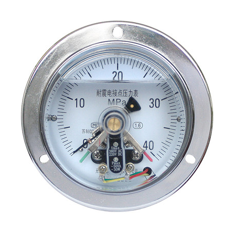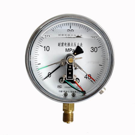 耐震電接點(diǎn)壓力表具有抗介質(zhì)脈動(dòng)和沖擊載荷,耐環(huán)境振動(dòng)等優(yōu)異特性,適用測量對銅和銅合金無腐蝕性的氣體,液體或蒸汽等介質(zhì)的壓力測量和控制,儀表設(shè)上、下限二位開關(guān)型接點(diǎn)裝置(可選雙上限或雙下限接點(diǎn)裝置),在壓力達(dá)到設(shè)定值時(shí)發(fā)出信號或通斷控制電路,供作業(yè)系統(tǒng)自動(dòng)控制或發(fā)訊用。其抗振結(jié)構(gòu)可有效抑制指針的抖動(dòng)、沖擊,保護(hù)接點(diǎn),使儀表指示清晰,電信號切換可靠,工作穩(wěn)定。廣泛應(yīng)用于機(jī)械、化工、石油、冶金、電力等工業(yè)生產(chǎn)過程壓力測量和控制。